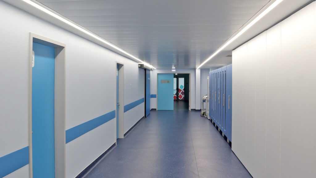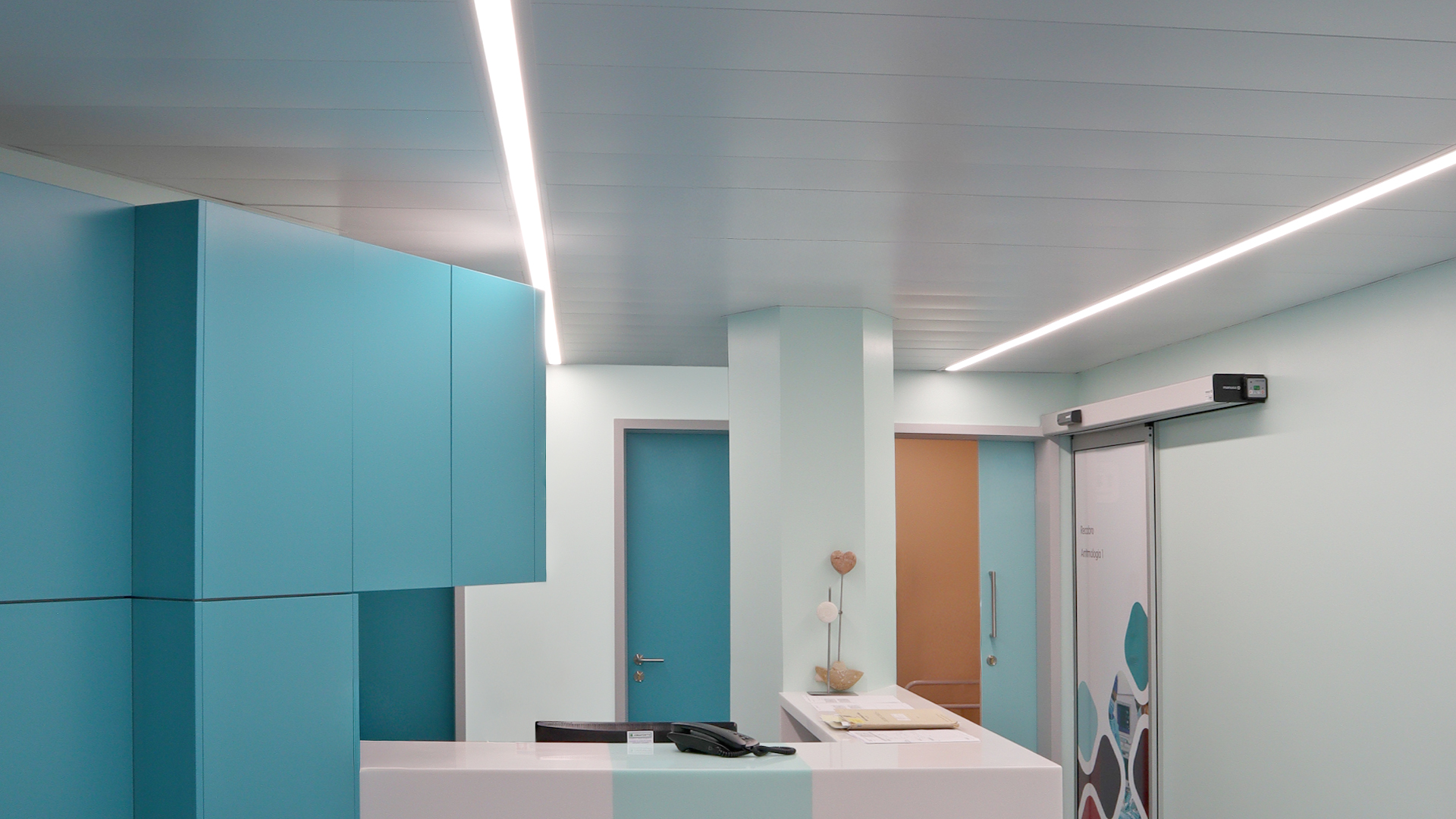 Nas áreas comuns, foram aplicadas as LINEAS Embutidas Sem Aba, criando uma iluminação discreta e homogénea que contribui para uma atmosfera acolhedora. Esta abordagem garante que os espaços de circulação sejam bem iluminados, promovendo o conforto e a segurança de pacientes e visitantes.